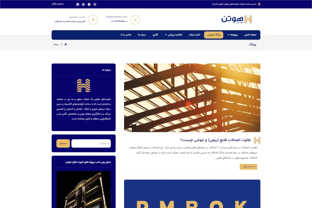 این وبسایت مجهز به وبلاگ با طراحی اختصاصی است تا مدیران وبسایت بتوانند آخرین مطالب و مقالات مرتبط با صنعت ساختمان را در اختیار خوانندگان خود قرار داده و همچنین با تولید محتوای جذاب و اختصاصی به رشد سئو و جذب مخاطب برای وبسایت خود کمک کنند.