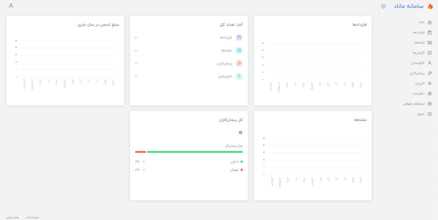 ماناد، سامانه تحت وب «مدیریت اتحادیههای تاسیسات مکانیکی گاز» است که توسط تیم برنامهنویسی آلتالبز جهت مدیریت و ثبت قراردادها و نقشههای لولهکشی گاز ساختمان پیادهسازی شده است. این سامانه به اتحادیهها و انجمنهای لولهکشی گاز ساختمان این امکان را میدهد تا بهراحتی اطلاعات مربوط به پیمانکاران و کارفرمایان و قرارداد لولهکشی میان این دو را در سامانه ثبت کنند. همچنین انجمنهای لولهکشی گاز قادر خواهند بود تا نقشههای مربوط به یک قرارداد را در سامانه ثبت و مدیریت نمایند. از جمله دیگر قابلیتهای این سامانه، سیستم گزارشگیری بسیار حرفهای و کامل آن است؛ بهطوری که با ارائه نمودارهای گوناگون، دید کاملی از عملکرد اتحادیه، انجمن و یا پیمانکاران به نمایش میگذارد. جهت کسب اطلاعات بیشتر در خصوص این سامانه با ما تماس بگیرید!